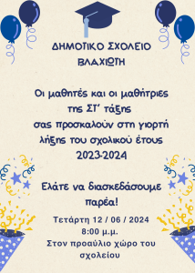 Την Παρασκευή 31/05/2024 η χορευτική ομάδα του σχολείου μας συμμετείχε στο 4ο Φεστιβάλ παραδοσιακών χορών “Σεργιάνι στην Ελλάδα”, που πραγματοποιήθηκε στο Σαϊνοπούλειο Αμφιθέατρο στη Σπάρτη, μαζί με άλλα σχολεία του Νομού Λακωνίας. Οι μαθητές/τριες του σχολείου μας χόρεψαν αντιπροσωπευτικούς χορούς από το νησί των Κυθήρων. Η εκδήλωση στέφθηκε με απόλυτη επιτυχία και όλα τα παιδιά των σχολείων που συμμετείχαν απέσπασαν το ζεστό χειροκρότημα του πολυπληθέστατου κοινού. Επίσης εκφράζουμε τις θερμές μας ευχαριστίες στα Διοικητικά Συμβούλια του Συλλόγου Γονέων και Κηδεμόνων του σχολείου μας και του Συλλόγου Γυναικών Βλαχιώτη για την απόφασή τους να αναλάβουν μέρος της δαπάνης για την ενοικίαση των παραδοσιακών ενδυμασιών.